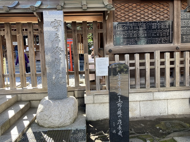 下谷神社の境内には、日本を代表する俳人である正岡子規の句碑もあります。明治二十七年(1894年)から8年間、下谷神社の近くに住んでいた子規は、境内に門弟や友人を集めてよく俳句を詠んでいました。平成十三年(2001年)、子規没後100周年を記念して台東区内に11基の句碑を建立することになりました。下谷神社の境内にある句碑もそのひとつです。碑には「寄席はねて 上野の鐘の 夜長哉」という、「寄席発祥の地」に因んで詠んだ句が刻まれています。