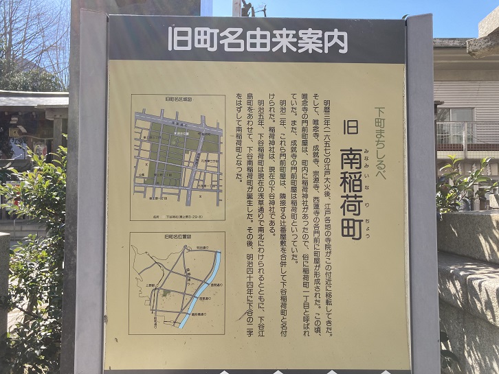 旧浅草通りに沿って多くの仏壇・仏具店が建ち並んでいます。近くにはお寺が散在しているからなのでしょう。ここにも旧町名案内板が立っています。地下鉄銀座線の稲荷町駅の名称は、下谷神社から由来しているんですね。