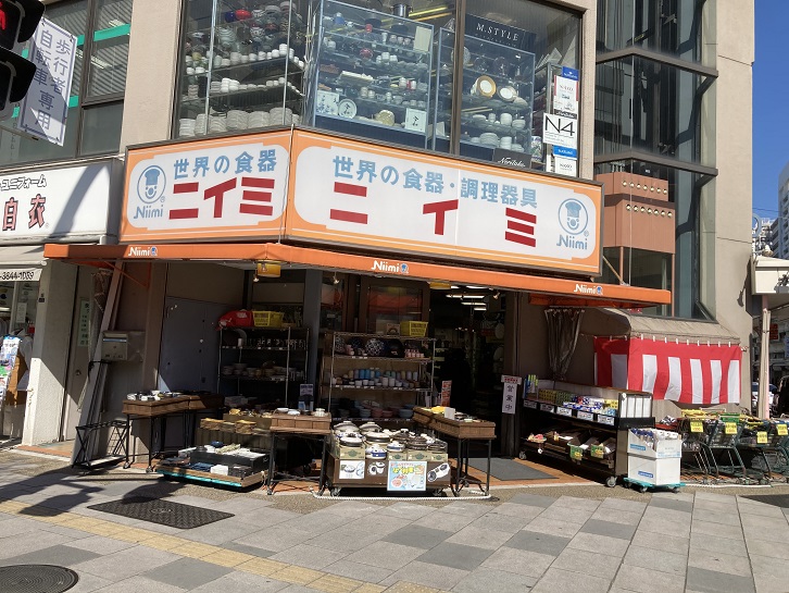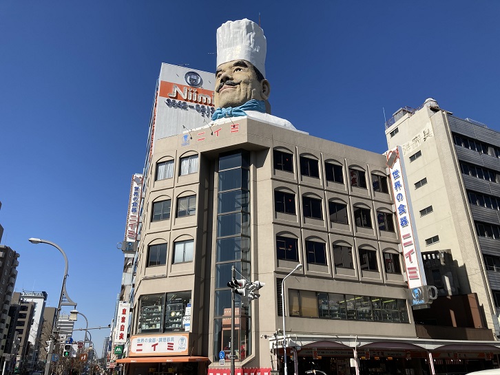 菊屋橋交差点の角に面して、「ニイミ」というテーブルウエア・調理機器・厨房用什器備品を扱う専門店のビルが建っています。店名は知らなくても、屋上に巨大なコックさんの像が鎮座するお店といえば分かるでしょう。コックさんの正式な名称は、「ジャンボコック像」で、高さ11m・重さ10tもあるそうです。ちなみに、コック像のモデルとなったのは、ニイミ店の二代目店主だそうです。現在の三代目社長室には、1/10サイズのオリジナルモデルが置かれているとのこと。巨大な像をどうやって屋上に取り付けたのでしょうかね?
