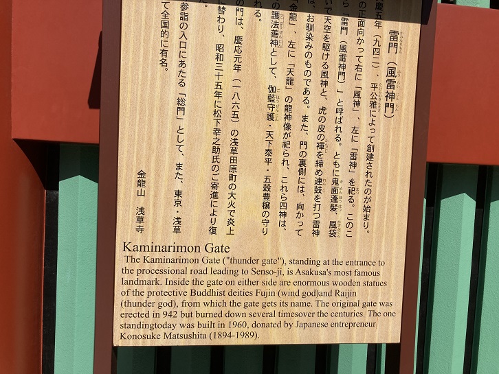 雷門は浅草のシンボルです。深紅の山門に吊された大提灯は、浅草を訪れた観光客が例外なく大提灯をバックにして写真に収まっている筈です。浅草寺の雷門は、慶応元年(1865年)に火災により焼失しましたが、松下電器の創業者である松下幸之助によって昭和三十五年(1960年)に再建されました。その後は、約10年ごとに大提灯の修復が行われてきました。現在の大提灯は、令和二年(2020年)4月17日に掛け替えられたものです。大提灯は約1年かけて造られ、高さ3.9メートル・重さ約700kgの大きさです。山門を護る雷神様の前に雷門の案内板が立っています。