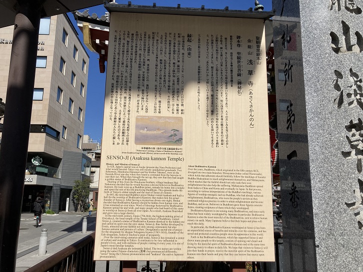 雷門の奥には、浅草寺に続く仲見世参道が延びています。土産物店や参道に付きものの団子屋さんなどが軒を連ねています。雷門の前の広場の入口には浅草寺の案内板が立っています。英語表記の案内文を最後まで読んだ外国人はまずいないでしょう。