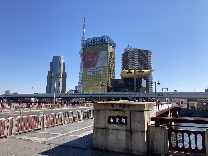 吾妻橋は隅田川に架かる橋です。かってはアサヒビール本社の奇抜な形状の建物が見えるだけの観光スポットでしたが、今では東京スカイツリーが並んで見え、記念写真に収まる観光客が後を絶ちません。