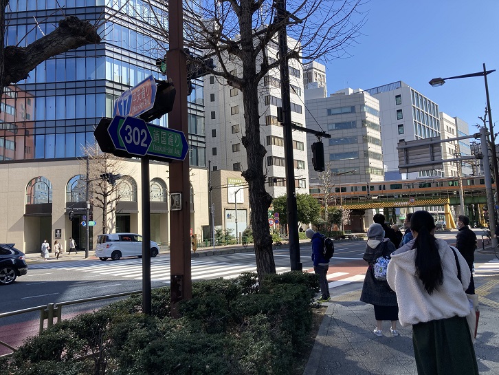 昭和通り・清洲橋通り・江戸通りと交差します。歩道の脇に東神田の町名由来板が立っています。東神田は千代田区ですが、江戸通りの先は中央区、神田川を挟んで北側は台東区、さらに隅田川の先は墨田区になっています。