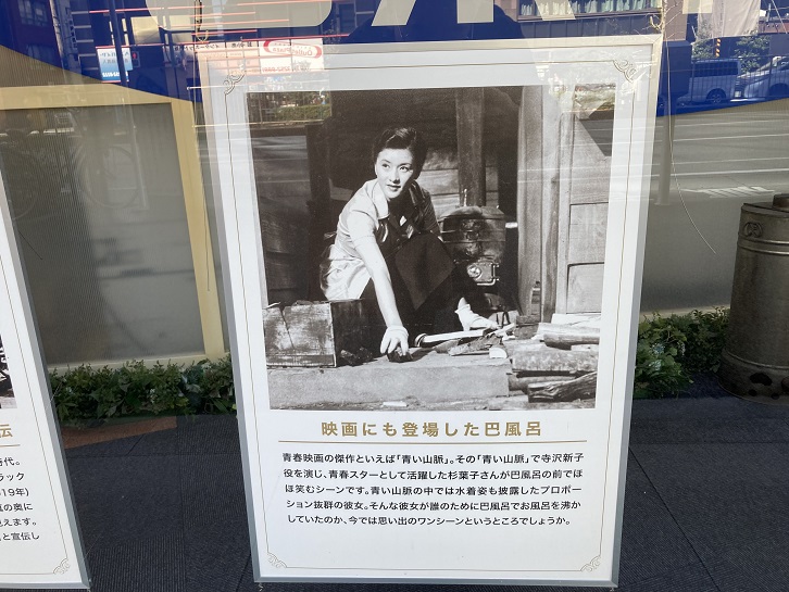 青春映画の傑作といえば「青い山脈」。その「青い山脈」で寺沢新子役を演じ、青春スターとして活躍した杉葉子さんが巴風呂の前でほほ笑むシーンです。青い山脈の中では水着姿も披露したプロポーション抜群の彼女。そんな彼女が誰のために巴風呂でお風呂を沸かしていたのか、今では思い出のワンシーンというところでしょうか。