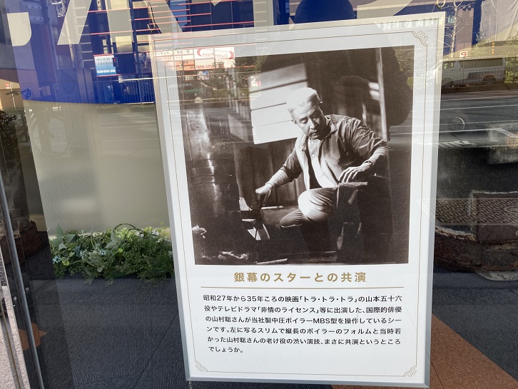 昭和二十七年から三十五年ころの映画「トラ・トラ・トラ」の山本五十六役やテレビドラマ「非情のライセンス」等に出演した、国際的俳優の山村聡さんが当社製中圧ボイラーMBS型を操作しているシーンです。左に写るスリムで縦長のボイラーのフォルムと当時若かった山村聡さんの老け役の渋い演技、まさに共演というところでしょうか。