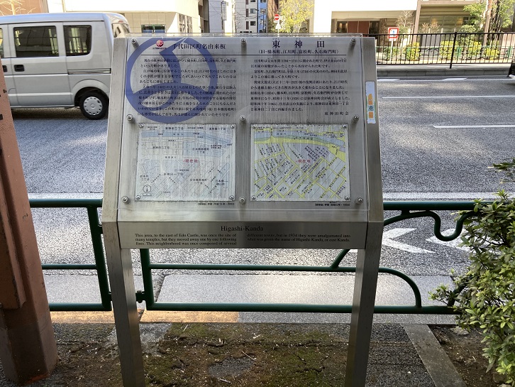 This area, to the east of Edo Castle, was once the site of many temples, but they moved away one by one following fires. This neighborhood was once composed of several different towns, but in 1934 they were amalgamated into what was given the name of Higashi-Kanda, or east Kanda.