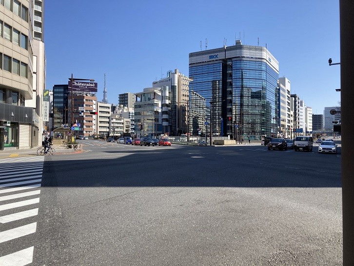 浅草橋交差点で靖国通りは終点となり、ここから先は京葉道路となります。それを区切るのが南北に走る江戸通りです。