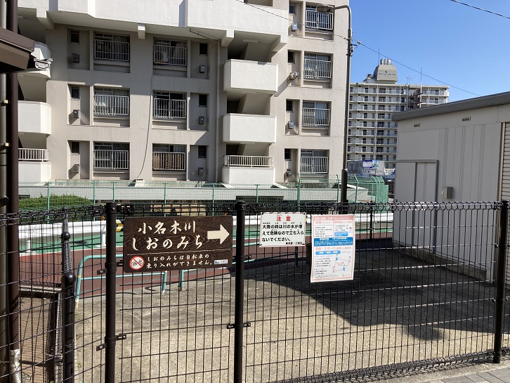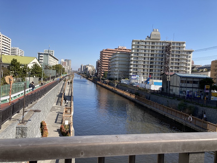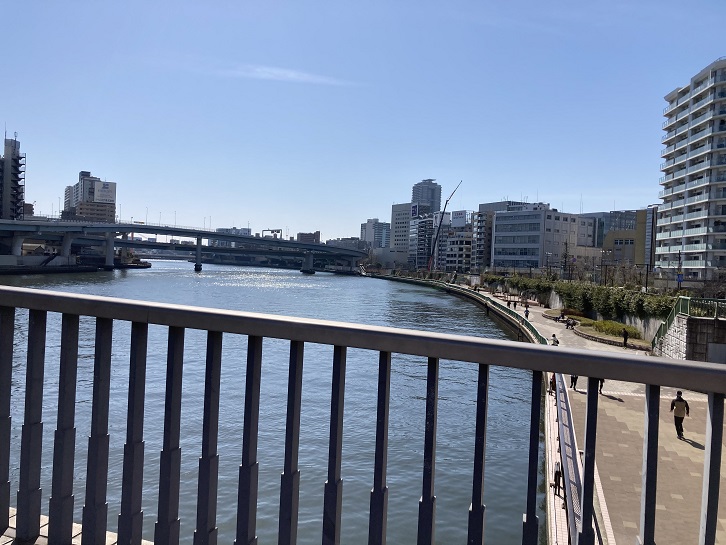 さらに、進開橋で小名木川を渡ります。小名木川は、隅田川と旧中川を結ぶ運河で、徳川家康の命令で開削されました。天正十八年(1590年)頃、江戸城を居城に定めた徳川家康は、兵糧としての塩の確保のため行徳塩田(現在の千葉県行徳)に目を付けました。しかし行徳から江戸湊(当時は日比谷入江付近)までの江戸湾(東京湾)北部は当時砂州や浅瀬が広がっていて船がしばしば座礁していたため、大きく沖合を迂回する他ありませんでした。また、沖合を迂回した場合でも風向きによっては湾内の強い風波を受けて船が沈むことがあり、安全とは言えませんでした。そこで家康は小名木四郎兵衛に命じて行徳までの運河を開削させたのが小名木川の始まりです。運河の開削によって行徳から江戸まで安全に塩を運べるようになると共に、航路が大幅に短縮されました。そのため、小名木川は、別名「しおのみち」とも呼ばれました。