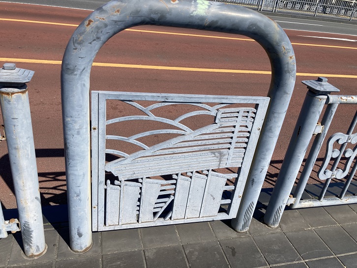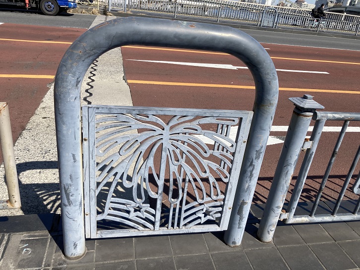 両国といえば、花火と相撲ですね。橋の欄干には両国の二大名物を図柄化した装飾がなされています。
