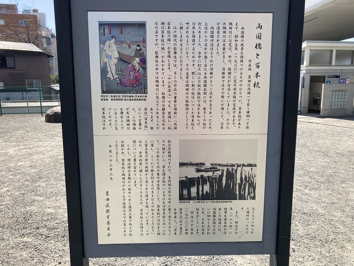 右端の案内板には両国橋を架橋した際に川底に打ち込まれた「百本杭」について記してあります。土木機械のない時代、流れの急な河川に長い橋を架けるのは大変な工事だったことでしょう。