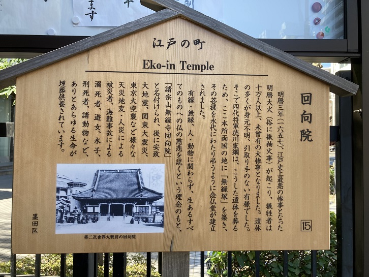 明暦三年(1657年)、江戸史上最悪の惨事となった明暦大火(俗に振袖火事)が起こり、犠牲者は十万人以上、未曾有の大惨事となりました。遺体の多くが身元不明、引取り手のない有様でした。そこで四代将軍コ川家綱は、こうした遺体を葬るため、ここ本所両国の地に「無縁塚」を築き、その菩提を永代にわたり弔うように念仏堂が建立されました。有縁・無縁・人・動物に関わらず、生あるすべてのものへの仏の慈悲を説くという理念のもと、「諸宗山無縁寺回向院」と名付けられ、後に安政大地震・関東大震災・東京大空襲など様々な天災地変・人災による被災者、海難事故による溺死者・遊女・水子・刑死者・諸動物など、ありとあらゆる生命が埋葬供養されています。