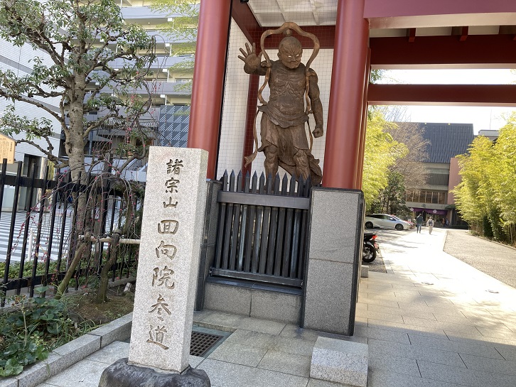 両国花火資料館の建物に隣接して、円筒を半分に割ったような形の屋根が特徴的な回向院の山門があります。