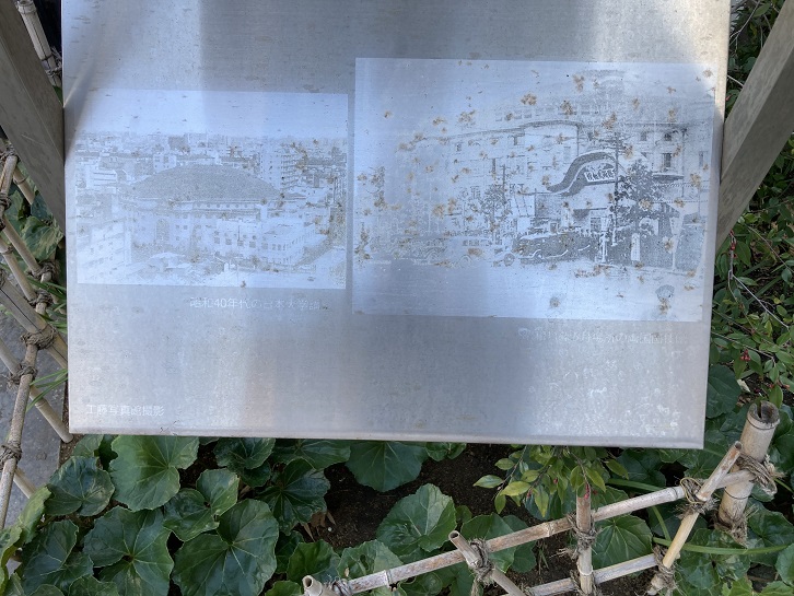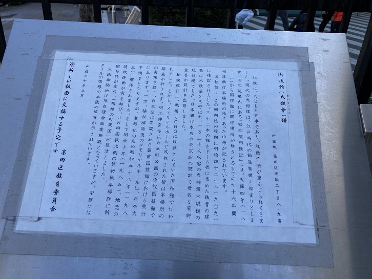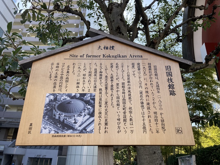 旧国技館は、天保四年(1833年)から回向院で相撲興行が行われていたことから、明治四十二年(1909年)に、その境内に建設されました。建設費は二十八万円(現在の価値では七十五億円程度)です。ドーム型屋根の洋風建築で、収容人数は一万三千人でした。開館当時は両国元町常設館という名前でしたが、翌年から国技館という呼び方が定着し、大鉄傘と愛称されました。しかし、東京大空襲まで、三度の火災に見舞われるなど御難統きで、戦後は進駐軍に接収されました。返還後は日大講堂として利用されていましたが、昭和五十八年(1983年)に解体されました。左手奥の両国シティコアビル中庭の円形は、当時の土俵の位置を示しています。