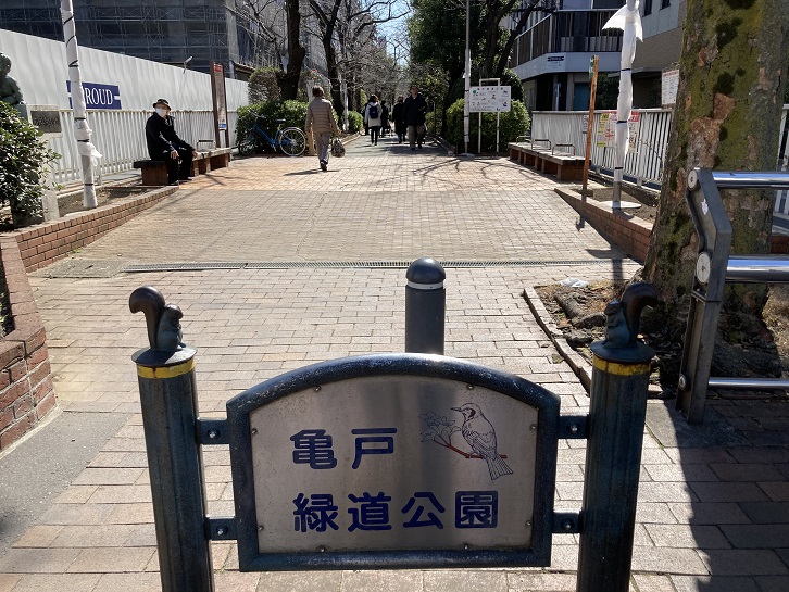 亀戸駅先の水神森交差点から南方向に細長く公園が延びています。都電29系統は水神森交差点で右折して専用軌道に入っていました。その線路跡に造られたのが亀戸緑道公園です。緑道の両側には植樹がなされ、お散歩やひとときの憩いに活用されています。緑道の東側にはサンストリート亀戸という複合商業施設がありましたが、現在は再開発がなされ、プラウドタワー亀戸クロスという大規模なマンション群が建設中です(2022年3月時点では竣工済のようです)。敷地内には2022年4月末に「KAMEIDO CLOCK」という商業施設もできるとのことです。