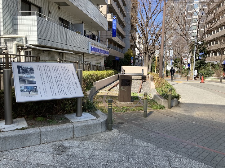ここには、かつて川があり、橋がありました。橋には都電が走っていました。時の流れとともに、都電は廃止され、高速道路が建設されました。やがて、川は埋め立てられ公園となり、役目を終えた橋が撤去されました。長年、みなさんに親しまれた橋の思い出を次の世代に伝えていくため、ここに「橋の記憶」を設置します。