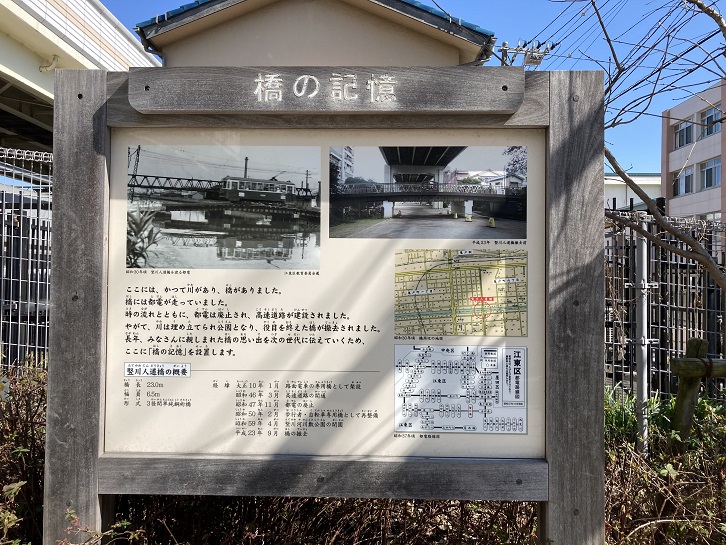 かつてこの場所には、路面電車が走るための「竪川専用橋」が水神森〜大島間の開通に合わせ、大正十年一月より架設されていた。当初の運営は大正二年十月に設立された城東電気軌道(株)で、昭和十七年二月に東京市営、同十八年七月に都営となった。ところが、昭和二十年の大空襲により甚大な被害を受けた。しかし復興に努め、昭和二十四年には区内全域が開通した。「チンチン電車」と呼ばれて親しまれ、便利だった都電も昭和三十年代の高度経済成長政策の頃から、自動車交通の急激な発達により道路が渋滞し、輸送力低下による赤字決算の連続となった。その結果、昭和四十七年、区内全線が廃止された。そして、昭和五十年、この橋は歩行者専用橋として改修され「竪川人道橋」と呼ばれるようになり、同五十四年、橋の南北の軌道敷は緑道公園に生まれ変わった。以来、この橋は平成七年の景観整備工事にて都電をモチーフに修景され、地域の歴史を伝えるモニュメンタルな橋として地域に親しまれてきたが、老朽化が進んできたこともあり、竪川河川敷公園の大規模改修に合わせ一体整備されることとなり、平成二十三年に橋は撤去され、現在の姿となっている。なお、モニュメントのレールの一部は「25系統」の亀戸九丁目で使われていたものを再使用しており、車輪は当時の写真等を参考にオブジェとしてデザインされたものである。