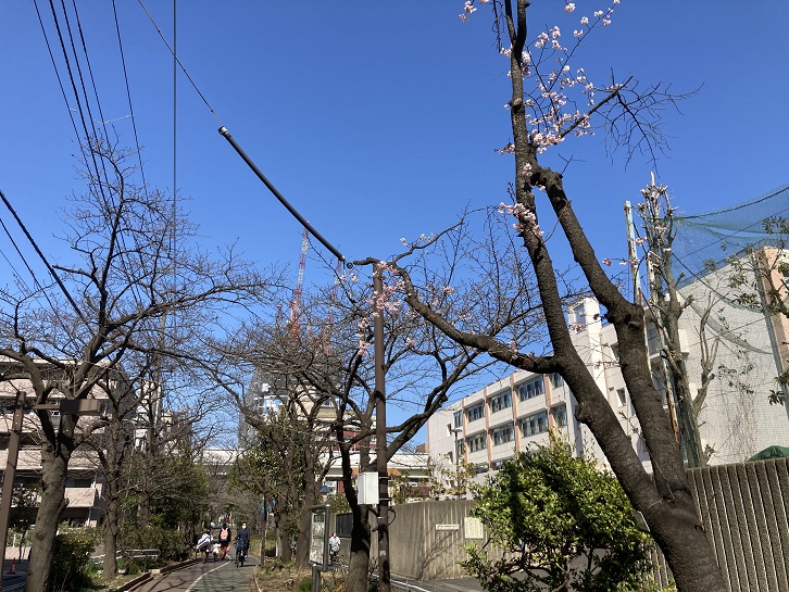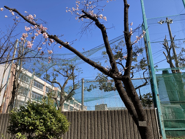 今日は2月の最終日ですが、ナント桜の花が咲いています。標札には「カンザクラ」と記されています。カンザクラは早咲きで知られる河津桜よりも開花は早く、花の色は淡い紅色です。青空にピンク色の桜の花が映えますね。