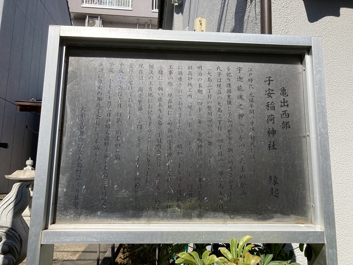 江戸時代元禄年間の中頃、村民によって宇迦能魂之神(うかのみたまのかみ)を祀り、護国豊穣と子孫の繁栄を願い鎮座されました。氏子は現在の大島三丁目・四丁目の一部と南五ツ目(大島二丁目の堅川沿いの一部)でした。明治の末期(四十三年)香取神社の社掌兼務となり、旧高砂鉄工所(現ミッドランドアベニュー)門前近くに鎮座されておりましたが、昭和三十年頃工場拡張工事の際、現在地にて町会の守護神として祀ってくれる様にと願い出あり、大島三丁目町会役員・世話人・氏子相談の上、当地にお祀りすることになりました。現在は、商売繁盛・学問・安産・子育ての神として崇拝を受けております。