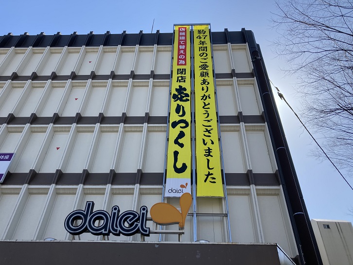 新大橋通りを渡ったところにダイエーのお店があります。懐かしい店名ですね。ダイエーは昔は全国チェーンの一大スーパーマーケットでしたが、バブル崩壊後の1990年代から経営不振になり、平成二十七年(2015年)1月からイオンの完全子会社となってイオングループに入りました。現在でも都内のところどころにダイエーの名を冠したお店はありますが、大島にもあるんですね。ダイエーは創業者の中内功が生まれ育った阪神地区を中心に店舗を展開し、ショッピングセンターや総合スーパーといった業態を日本で初めて導入して、戦後の日本の流通・小売業界を発展させた代表的な企業として知られています。創業以来一貫して「価格破壊」をスローガンとし、「よい品をどんどん安く」や「お客様のために」をスローガンに、「主婦の店」という商号で一世を風靡しました。残念ながら、ダイエー大島店は「店舗建て替えのため本日をもって閉店」という垂れ幕がかかっています(注:2022年3月の情報では、建て替え計画はなくなり、跡地には50階建ての超高層マンションが建つみたいです)。営業最終日とのことですので、店内を見ていこうと思います。おんや、お魚売り場に大量のサーモンの切り身が並んでいますね。最近はサーモンは高値の花と化しましたが、最終セールとあって爆安で売られています。お散歩の途中ですが、つい大量買いしてしまいます。今日の晩ご飯はサーモンのお刺身と白ワインで決まり!