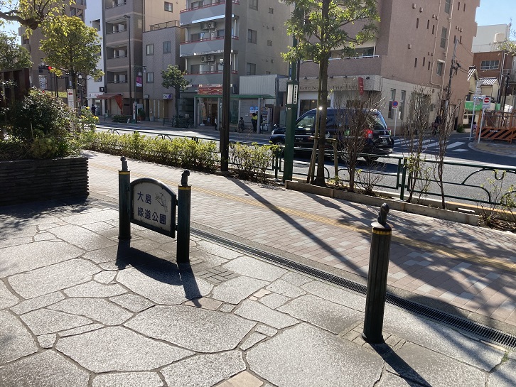 大島緑道公園の遊歩道はダイエーの先で弧を描き、明治通りに出ます。