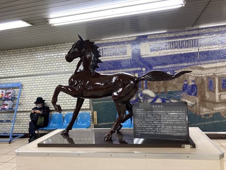 ちなみに、都営地下鉄浅草線の馬喰横山駅の構内には、馬喰横山町の町名の由来となった馬のモニュメントと案内板が置かれてます。