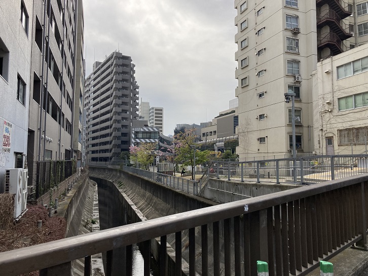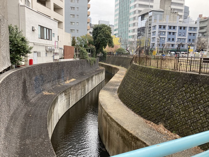 渋谷川の護岸と川底はがっちりとしたコンクリートで固められています。普段は殆ど水は流れていませんが、大雨の時などは水位が上がり、流れも速くなります。かってはドブ川だったのですが、現在では水質は大幅に改善されています。