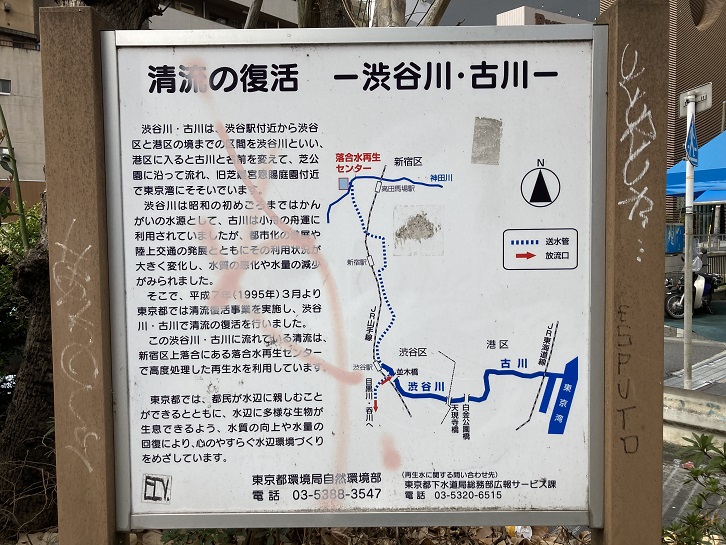 渋谷川・古川は、渋谷駅付近から渋谷区と港区の境までの区間を渋谷川といい、港区に入ると古川と名前を変えて、芝公園に沿って流れ、旧芝離宮恩賜庭園付近で東京湾にそそいでいます。渋谷川は昭和の始めごろまではかんがいの水源として、古川は小舟の舟運に利用されていましたが、都市化の進展や陸上交通の発展とともにその利用状況が大きく変化し、水質の悪化や水量の減少がみられました。そこで、平成七年(1995年)3月より東京都では清流復活事業を実施し、渋谷川・古川で清流の復活を行いました。この渋谷川・古川に流れている清流は、新宿区上落合にある落合水再生センターで高度処理した再生水を利用しています。東京都では、都民が水辺に親しむことができるとともに、水辺に多様な生物が生息できるよう、水質の向上や水量の回復により、心のやすらぐ水辺環境づくりをめざしています。