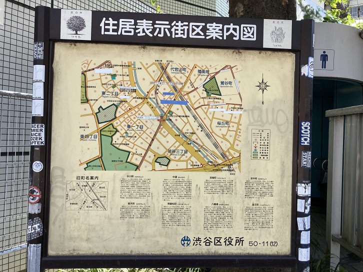 並木橋交差点の角に渋谷地区の町名案内板が立っています。八幡通りの名称は金王八幡神社に由来するんですね。