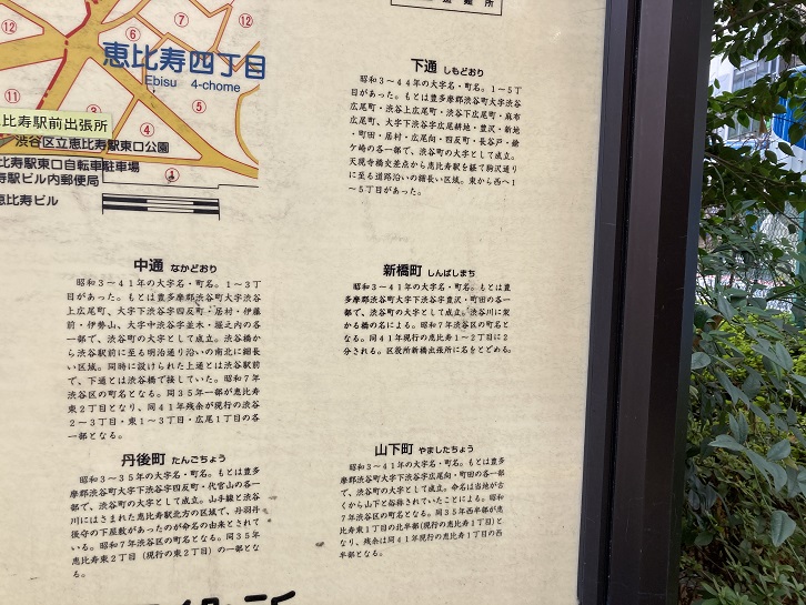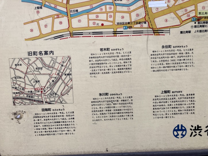 渋谷橋交差点に架かる歩道橋の袂に恵比寿・広尾地区の町名案内板が立っています。大字(おおあざ)とは、市町村内の区画名称である字(あざ)の一種です。明治二十二年(1889年)に公布された市制および町村制の施行時にそれまでの村名や町名を残したものです。一方、江戸時代からの村(藩政村)の下にあった区画単位は小字(こあざ)と言います。今でも地方の町には大字を冠するところがありますね。旧山手通りが駒沢通りに交わる交差点の名前が「鎗ヶ崎交差点」になっていますが、かっての町名の名残りなのでしょうか?