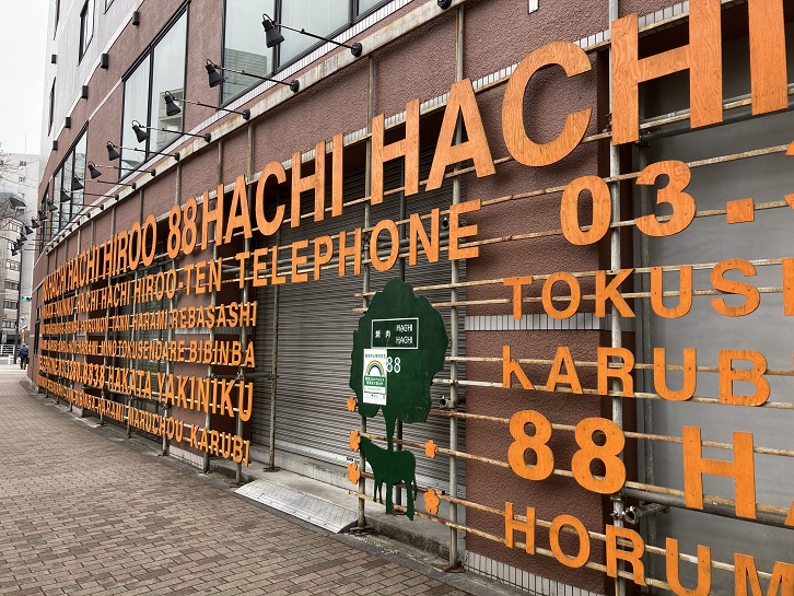 「広尾散歩通り」がどこからどこまでなのかよく分かりませんが、地下鉄広尾駅から明治通りに交わるまでの商店街を指すのではないかと思います。ちなみに、この道は黒田長政が藩主を務めた福岡藩黒田家の菩提寺として知られる祥雲寺の参道だったそうです。広尾という町が祥雲寺の門前町として発展してきた経緯がありますので、歴史ある通りなんですね。明治通りから分岐する交番の向かいに、「88HACHIHACHIHIROO」と大書きした建物があります。前々から気になっていたのですが、よくよく見ますと、「HAKATA YAKINIKU」と書いてあります。焼肉屋さんだったんですね。おしゃれな空間で最高のお肉をリーズナブルに楽しめるというのがキャッチフレーズだそうです。焼肉って、博多の名物だったのかな?(ネットの情報によりますと、2021年5月末で閉店したとのことです)