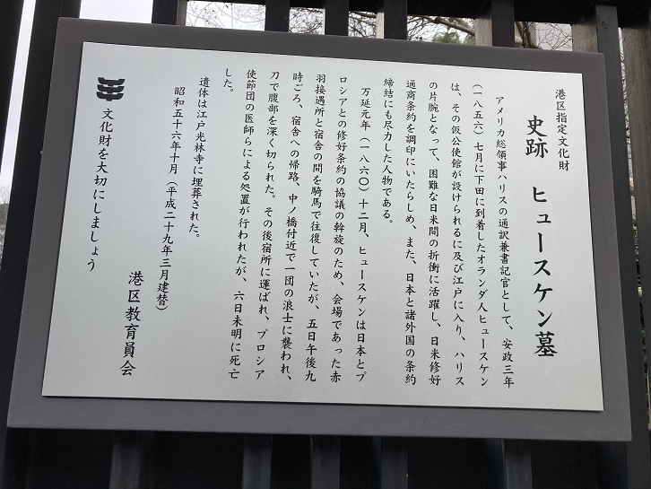 首都高目黒線の天現寺ランプ前に光林禅寺があります。格式の高いお寺とされ、墓地には大名・旗本・大企業の役員などのお墓が多くあります。2018年9月30日、光林禅寺において女優・樹木希林の葬儀が執り行われ、その後亡くなった夫の内田裕也と一緒に光林禅寺に埋葬されました。そんな有名人に混じって、光林禅寺には幕末時代の外国人のお墓もあります。ヘンリー・コンラッド・ジョアンズ・ヒュースケンという若者で、オランダ人ですが一家でアメリカに渡りアメリカ国籍をとった後、当時の日本がオランダ語を外交時の公用語としていたこともあって、英語とオランダ語がわかる人物としてアメリカ総領事ハリスの通訳として雇われました。ハリスと共に来日した後で日本語も習得し、日米修好通商条約の締結に貢献しました。英語とオランダ語ができる貴重な通訳として、ヒュースケンは各国から通訳を依頼され、プロイセン王国(現在のドイツ北部からポーランド西部にかけてを領土とし、ドイツ統一の中核となった王国)の仕事も引き受けていました。万延元年12月4日(5日という記述もあります)、ヒュースケンは江戸城の周りを馬でまわって(ヒュースケンは乗馬が好きでした)午後6時頃にプロイセン王国の使節宿舎であった芝赤羽接遇所(北区の赤羽でなく、現在の赤羽橋の近くにあった)に到着し、プロイセン王国の使節らと夕食を摂ったあとも夜8時半頃まで雑談に興じ、その後幕府の3名の騎馬役人・従僕ら4人・馬丁2名を警護に付けて善福寺のアメリカ大使館への帰路につきました。しかし、その途中の夜9時頃、芝薪河岸にある中の橋付近で攘夷派「浪士組」所属の薩摩藩士8名に襲撃されました。腸を切断するほどの深手を負い、約200m先で落馬したヒュースケンはアメリカ公使館に運ばれ、ハリスはプロイセン王国使節団の医師と数名を呼び寄せました。また、既に駆けつけていた日本人医師らと懸命な手当をおこないましたが、翌5日(6日という記述もあります)に失血死で28歳の若さで息を引き取りました。ヒュースケンの遺骸はプロイセン王国が用意した棺に納められるとアメリカ国旗で包まれ、善福寺は土葬が禁じられていたために、土葬が可能な光林禅寺に運ばれて埋葬されました。