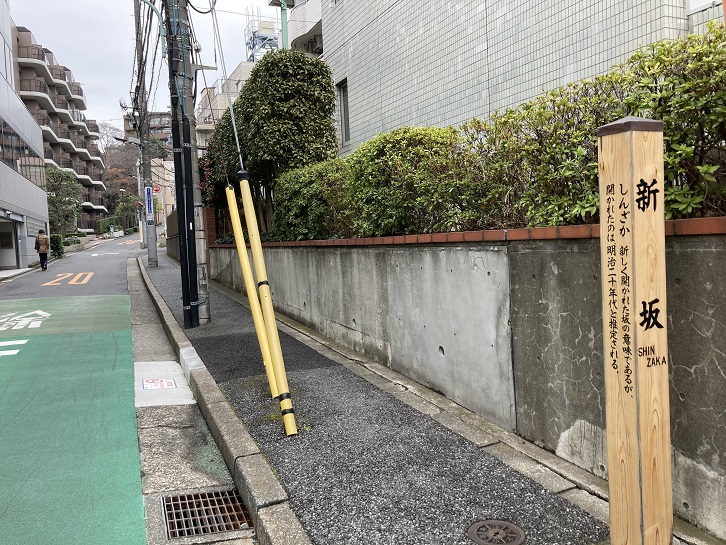 しんざか。新しく開かれた坂の意味であるが、開かれたのは明治二十年代と推定される。
