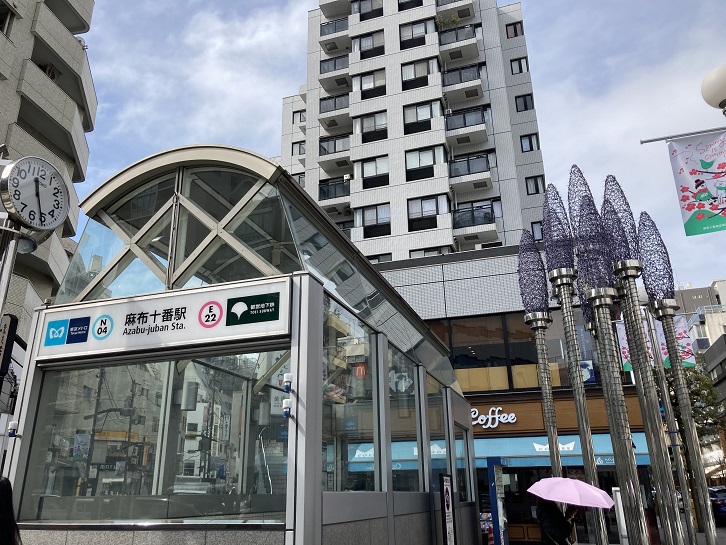 麻布通りを進むと、左手に麻布十番の駅があります。麻布十番駅には南北線と大江戸線の2本の地下鉄が通っています。地下鉄なので、地上にはガラス張りの出入口しかありません。出入り口の両側は長〜〜〜く延びる商店街になっていますが、大規模なビルや商業施設は少なく、雑居ビルや商店が多く建ち並んでいます。以前は鉄道の駅がなく「陸の孤島」とも呼ばれていましたが、現在では麻布十番駅もでき、複合施設や六本木ヒルズが近いなど人気の高い街となっています。ちなみに、「麻布」の地名は、その昔この一帯で麻を多く植えて布を織っていたことに由来し、麻がよく育つ土地という意味で「麻生」になり、これが転じて「麻布」となりました。「十番」の地名は諸説ありますが、元禄十一年(1698年)に五代将軍徳川綱吉が白金御殿を建築する際、古川を利用して建材を運び込んだ人足(労働者)が一番から十番のグループに編成され、この地域の人々が十番目に当たっていたことに由来するという説が有力です。麻布十番駅横の路上に奇妙なモニュメントが置いてあります。「微笑みのモニュメント 父と息子」なんだそうです。結構インパクトが強くて驚きました。何のために設置してあるのでしょうか?これは、麻布十番商店街が12ケ国の大使館の協力を頂き、「微笑み」をテーマにして作成されたものなのです。この「父と息子」はジンバブエ共和国の出展なのだそうです。