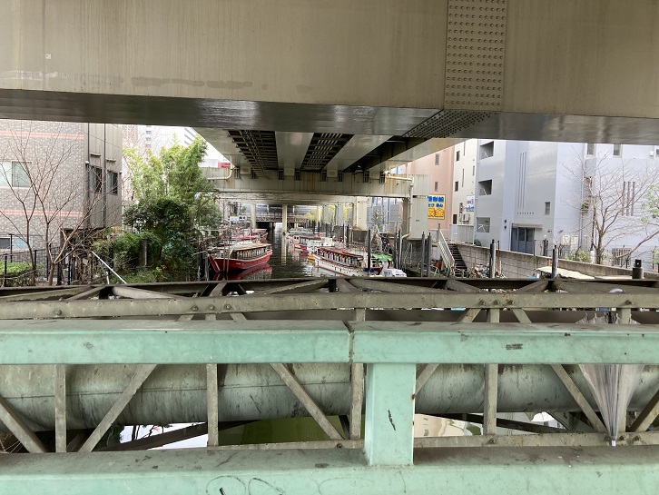 金杉橋は、古川に架かる国道15号線の橋で、現在の橋は1971年に架替えられたものです。江戸時代に橋が架けられた際、近くにあったセンダンの木が光って見えるようであったことから金杉橋と名づけられたそうです。橋の下は東京湾で営業を行う屋形船の係留場所となっていて、川面には様々な船が浮かんでいます。