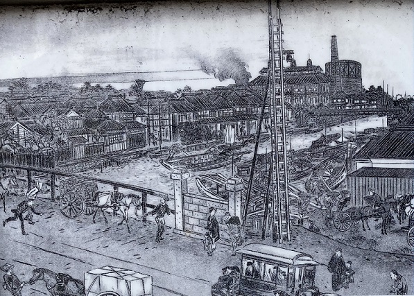金杉橋の近くに芝地区旧町名由来板が立っています。案内板の挿絵には、橋の上に既にレールが敷かれているように見えます。明治三十五年(1902年)の芝金杉橋と表記されていますので、軌道式の乗合馬車か何かが通っていたようです。