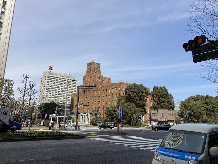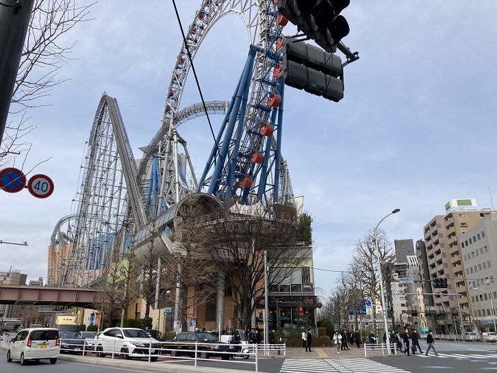 交差点の左手先には後楽園遊園地があります。コロナ禍は未だ収まっていませんが、ジェットコースターからは黄色い悲鳴が聞こえてきます。ウイルスが飛び散らなければいいのですが。