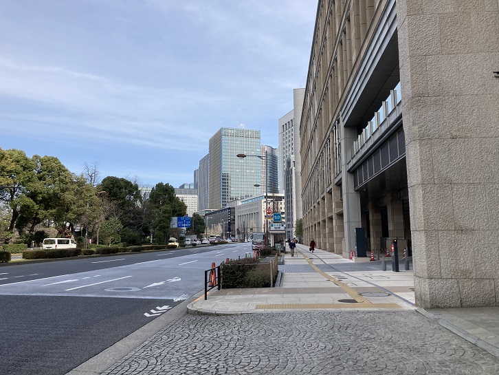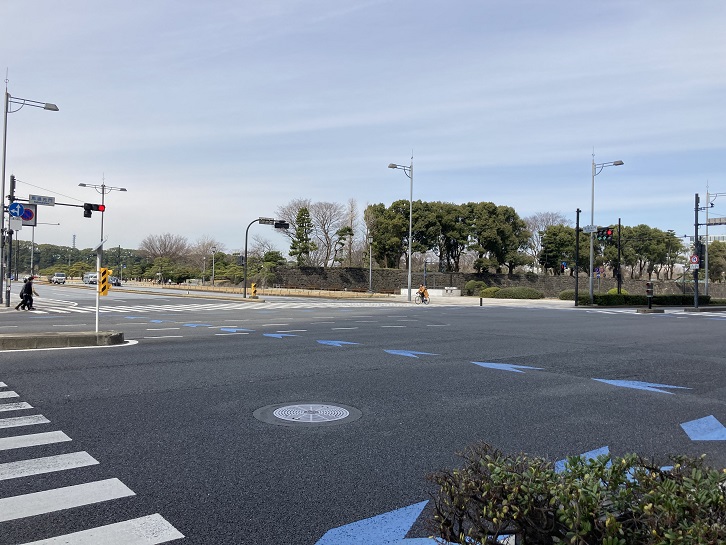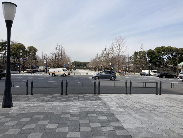 和田倉門交差点にやってきました。東京駅丸の内中央口から皇居前内堀通りまでを結び和田倉門交差点で日比谷通りと十文字に交差する道路は、天皇が行幸するため東京駅までの移動に利用した道路であるところから行幸通り(「ぎょうこうどおり」または「みゆきどおり」)と呼ばれています。和田倉門交差点から東京駅前の東京駅中央口交差点までの区間は、正式には東京都道404号皇居前東京停車場線と呼ばれる特例都道となっています。幅員約74mというこの都道の内側の車線はふだん通行止めになっていますが、皇室行事と外国大使の信任状捧呈式の馬車列が東京駅がら皇居に向かうときだけ使われています。