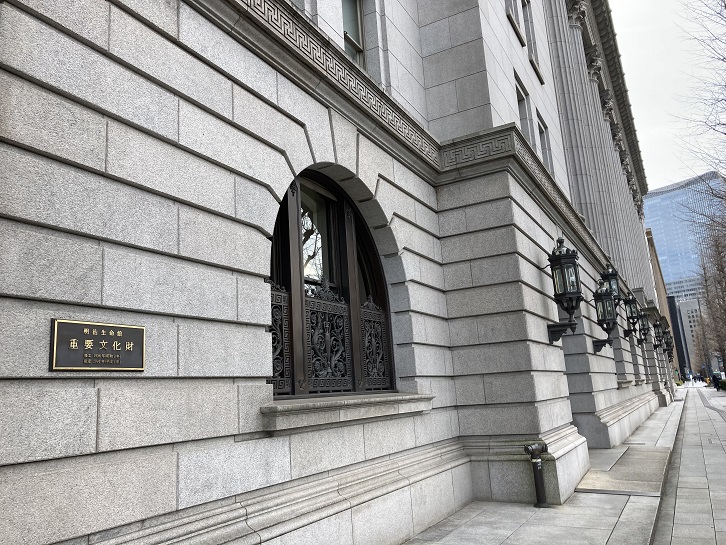 馬場先門交差点の角に建つ明治生命館は、昭和九年(1834年)に竣工し、古典主義様式の最高傑作として高く評価され、平成九年(1997年)5月に昭和期の建造物としては初めて国の重要文化財に指定されました。戦後は連合国軍最高司令官総司令部(GHQ)に接収され、アメリカ極東空軍司令部が置かれましたが、昭和三十一年(1956年)に返還されました。平成十三年(2001年)から改修工事が行われ、隣接地に30階建ての明治安田生命ビルを建設して一体的に利用することで、歴史的建造物を活用しながらの全面保存が実現しました。第一生命館と同様に歴史的建造物が後世に残るということは素晴らしいですね。