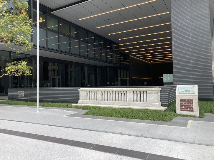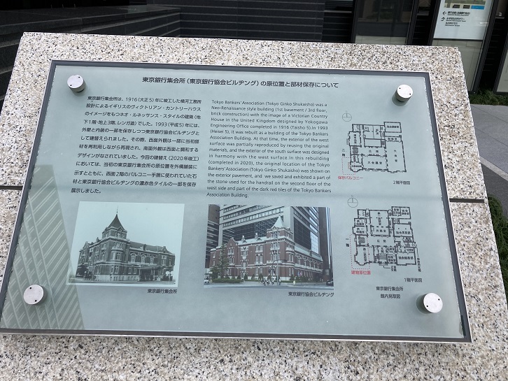 Tokyo Bankers' Association (Tokyo Ginko Shukaisho) was a Neo-Renaissance style building (1st basement / 3rd floor, brick construction) with the image of a Victorian Country House in the United Kingdom designed by Yokogawa Engineering Office completed in 1916 (Taisho 5). In 1993 (Heisei 5), it was rebuilt as a building of the Tokyo Bankers Association Building. At that time, the exterior of the west surface was partially reproduced by reusing the original materials, and the exterior of the south surface was designed in harmony with the west surface. In this rebuilding (completed in 2020), the original location of the Tokyo Bankers' Association (Tokyo Ginko Shukaisho) was shown on the exterior pavement, and we saved and exhibited a part of the stone used for the handrail on the second floor of the west side and part of the dark red tiles of the Tokyo Bankers Association Building.