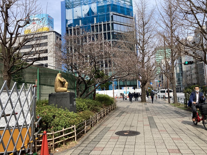 神田橋のすぐ先にある「神田橋公園」内に奇妙な彫刻が置かれています。最初は黄金の猿の像かと思ったのですが、コガネ虫を擬人化したものだそうです。ひょっとして本物の黄金でできているかも!