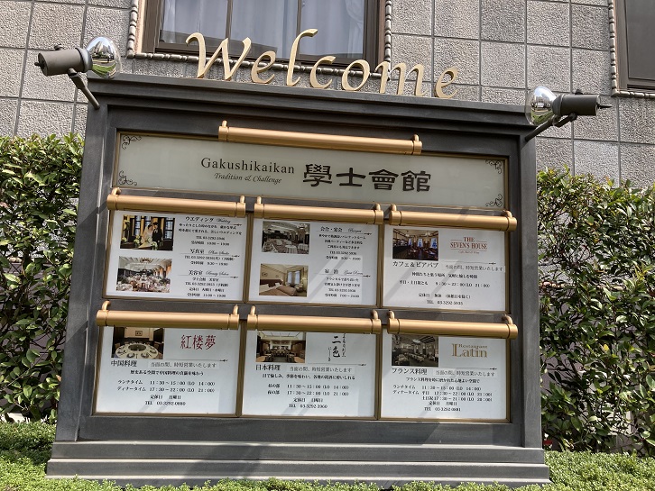 学士会館の建物の前には、館内レストランの案内が掲示されています。学者の先生はグルメだといわれますが、メニューにもそれが表われているようです。
