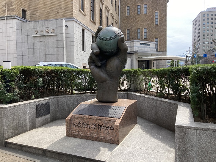 学士会館の敷地の外れに「日本野球発祥の地」と題したモニュメントが置かれています。ボールを握った手は手首で途切れており、何か不気味な感じがします。