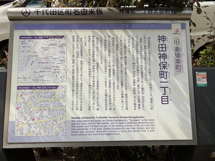 This area used to be known as Omote-Sarugakucho. "Sarugaku" is the name that was once used for Noh theater, one of Japan's traditional performing arts. The master and members of one of the famous schools of the art once had their residences in this area. Omote-Sarugakucho was later divided, and one section was renamed Jimbocho 1-chome, a name that derives from a well-known samurai who lived in the neighborhood.