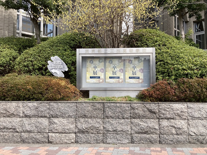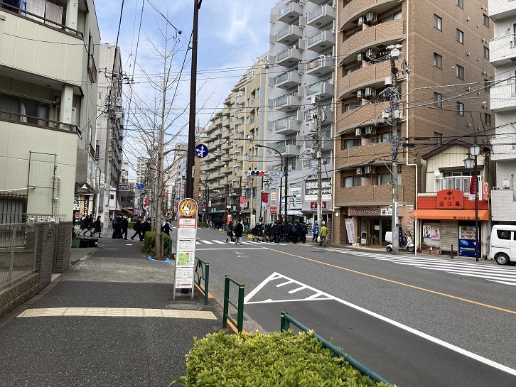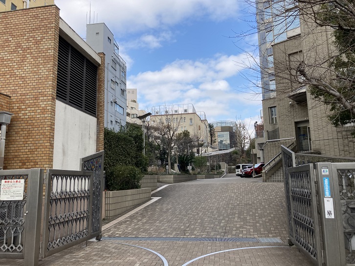 交差点の右手先には東京工芸高校があります。都立高校にしては大きな校舎です。通常、工業高校は男子生徒の在籍率が高いのですが、ここはデザイン系の学科が多い関係上、在籍する生徒の約8割が女子生徒で占められているとのことです。卒業生には芸術関係の有名人が多いですね。東京工芸高校の裏手は高台になっていて、その上に桜蔭学園の校舎が建っています。中高一貫の女子校で、中学入試では女子学院中学校・雙葉中学校と共に「女子御三家」といわれています。2022年の大学入試において、医学部への驚異的な合格者数が話題になりました。