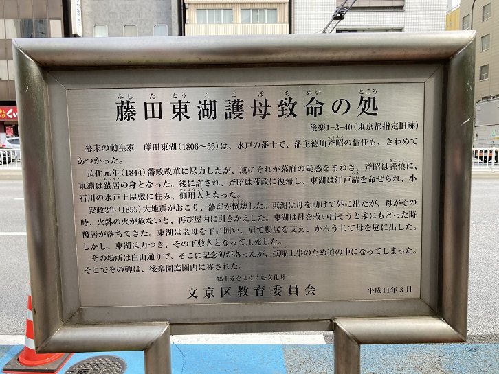 幕末の勤皇家藤田東湖(1806年〜1855年)は、水戸の藩士で、藩主徳川斉昭の信任も、きわめてあつかった。弘化元年(1844年)藩政改革に尽力したが、逆にそれが幕府の疑惑をまねき、斉昭は謹慎に、東湖は塾居の身となった。後に許され、斉昭は藩政に復帰し、東湖は江戸詰を命ぜられ、小石川の水戸上屋敷に住み、側用人となった。安政二年(1855年)大地震がおこり、藩邸が倒壊した。東湖は母を助けて外に出たが、母がその時、火鉢の火が危ないと、再び屋内に引きかえした。東湖は母を救い出そうと家にもどった時鴨居が落ちてきた。東湖は老母を下に囲い、肩で鴨居を支え、かろうじて母を庭に出した。しかし、東湖は力つき、その下敷きとなって圧死した。その場所は白山通りで、そこに記念碑があったが、拡幅工事のため道の中になってしまった。そこでその碑は、後楽園庭園内に移された。