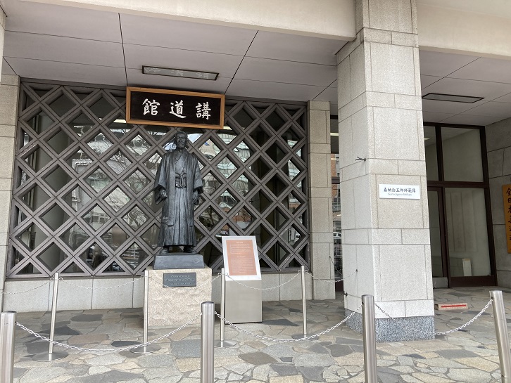 春日町交差点の近くに講道館のビルが建っています。入口の横に講道館の創始者である嘉納治五郎の銅像と業績を記した案内板が置かれています。