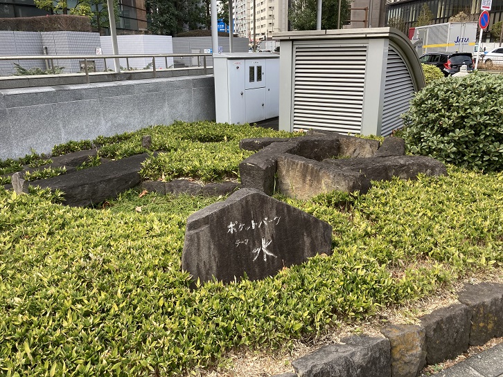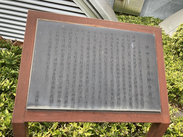ここに使われている石は、江戸時代に神田上水で使われていた石樋の一部で、昭和六十二年、外堀通りの工事中に現在の水道橋付近から発掘されたものです。神田上水とは近世都市の江戸で最初に整備された上水道であり、コ川家康が江戸入りと同時に造らせたと言われています。水源となる井の頭池の湧水を、大洗堰(現在の文京区関口)を経てから水戸屋敷(現在の小石川後楽園一帯)に入れ、そこから先は暗渠(地下の樋)で通しています。この暗渠で使われていたのが、石樋(石で作った樋)です。なお、お茶の水坂からは、掛樋(木で作った樋)で神田川の上を横断させて、神田・目本橋方面に飲料水として給水されていました。