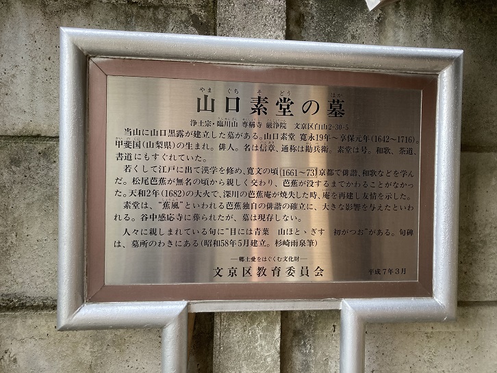 白山下交差点の手前に厳浄院というお寺があります。「目には青葉 山ほとゝぎす 初がつお」の俳句で知られる山口素堂のお墓があるそうです。