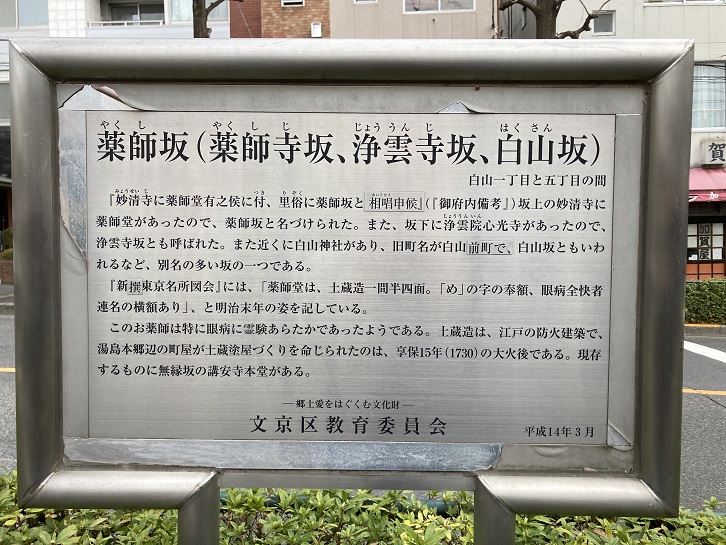 「妙清寺に薬師堂有之候に付、里俗に薬師坂と相唱申候」(「御府内備考」)。坂上の妙清寺に薬師堂があったので、薬師坂と名づけられた。また、坂下に浄雲院心光寺があったので、浄雲寺坂とも呼ばれた。また近くに白山神社があり、旧町名が白山前町で、白山坂ともいわれるなど、別名の多い坂の一つである。「新撰東京名所図会」には、「薬師堂は、土蔵造一間半四面。「め」の字の奉額、眼病全快者連名の横額あり」、と明治末年の姿を記している。このお薬師は特に眼病に霊験あらたかであったようである。土蔵造は、江戸の防火建築で、湯島本郷辺の町屋が土蔵塗屋づくりを命じられたのは、享保一五年(1730年)の大火後である。現存するものには無縁坂の講安寺本堂がある。