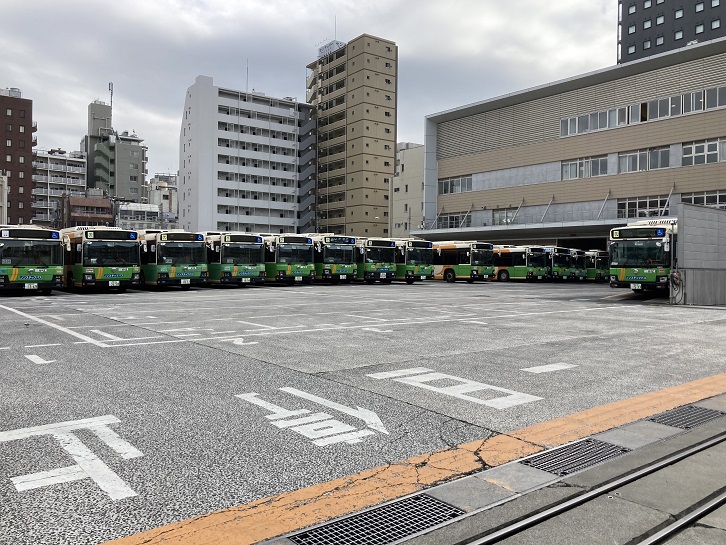 巣鴨地蔵通商店街入口と白山通り・国道17号を挟んだ向かいには、都営バスの巣鴨自動車営業所があります。巣鴨営業所は、かっての都電巣鴨車庫の跡地にできました。都電時代は白山通り上に巣鴨車庫電停があり、ここから車庫へ直接出入りしていましたが、現在のバスは白山通りから車庫の脇道を通って出入りするようになっています。都電35系統はこの巣鴨車庫電停で終点となります。巣鴨車庫は大正二年の開設で、震災直前の頃には都心方面への7つの路線を受け持つ一大拠点となり、震災後は板橋方面への路線延伸を支えたターミナルとして機能しました。全盛期には100両近い都電が広々とした車庫スペースを出入りしていました。都電巣鴨車庫の廃止は都電35系統の最終運転日となった昭和四十三年2月で、現在見られる都営バス営業所の建物は戦後に建て替えられた都電車庫時代の建物がそのまま使われています。